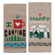 100% Cotton Imported Camping themed printed chambray tea towel Great for drying dishes & glassware Can be used to make Cafe curtains, keeping baked goods warm, or on a countertop to aid in dish drying Loop for Hanging when not in use 100Percent cotton, machine washable